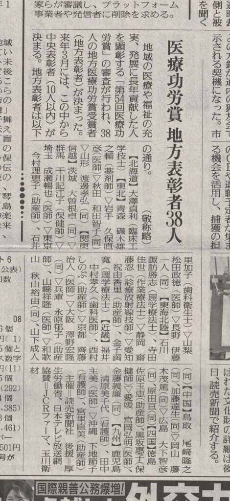 当院歯科衛生士石井が第54回医療功労賞(読売新聞社主催)の地方表彰者に選ばれました。
